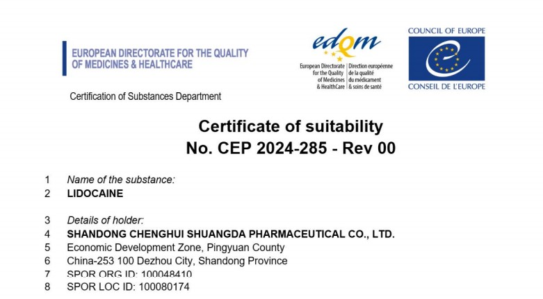 2025年10月22日,我公司原料藥2025年10月9日,我公司原料藥利多卡因歐洲CEP注冊獲批,并已收到歐洲藥品質(zhì)量管理局(EDQM)頒發(fā)的歐洲藥典適用性證書(CEP證書)。